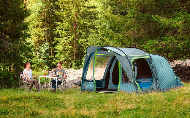 Das Zelt verfügt über ein starkes, aber leichtes Fiberglasgestänge und eine leistungsstarke Außenhülle mit 4.000mm Wassersäule. Diverse Belüftungsöffnungen ermöglichen eine gute Luftzirkulation im Zelt und der voll integrierte PE-Boden im Wohn- und Schlafbereich sorgt für sauberes, trockenes und ungezieferfreies Campingerlebnis.