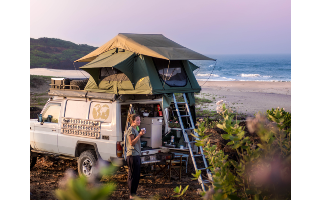 Kompromisslos auf Qualität und einfache Handhabung optimiert, öffnet sich das auf dem PKW-Dach verstaute Zelt mit nur wenigen Handgriffen in ein komfortables und geräumiges Schlafzelt mit echter Matratze von 140cm Breite und 240cm Länge.Eine Leiter mit flachen, barfuss-geeigneten Stufen gibt Ihnen leichten Zugang in den hellen gut durchlüfteten Schlafraum.