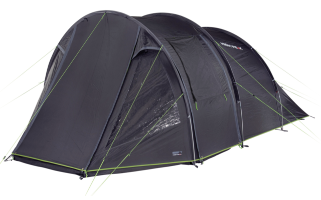 Familien-Tunnelzelt in Stehhöhe. Der große Vorbau mit Seitentür und Gazefenster kann optimal belüftet werden und bietet reichlich Platz für die Campingausrüstung und Aufenthalt bei schlechtem Wetter. Klarsichtfolienfenster bringen das Tageslicht in die Wohnung und die Gardinen schützen vor neugierigen Blicken.
