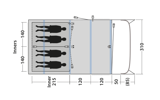 - Die vorgebogenen Luftschläuche sorgen für eine großzügige Deckenhöhe und einen geräumigen Innenraum
