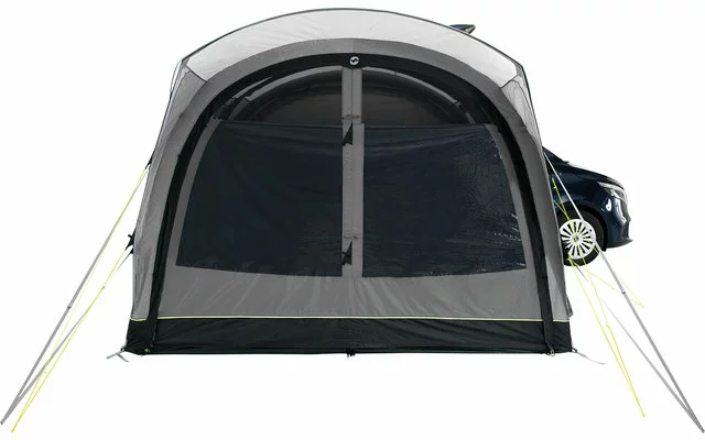 Das freistehende Busvorzelt Newburg 240 Air wird mit drei Luftschläuche aufgeblasen und bietet einen Innenraum von 240 x 300cm an. Die wegrollbare Vordertür unter dem abgerundeten Vordach ist mit einem Insektennetz ausgestattet. Auch der Seiteneingang auf der rechte Seite hat eine zusätzliche Insektenschutz-Tür. Das optionale Innenzelt bietet zwei Schlafplätze. In der Vorzeltschleuse befinden sich Eingänge auf beiden Seiten und für den Boden ist eine Bodenplane im Lieferumfang. Das Vorzelt lässt sich mithilfe eines Doppel-Keders (5 und 7 mm) oder mit Spannleinen anbauen. Sturmbänder sorgen zusammen mit den robusten Luftschlauchsystem für eine ausgezeichnete Stabilität.